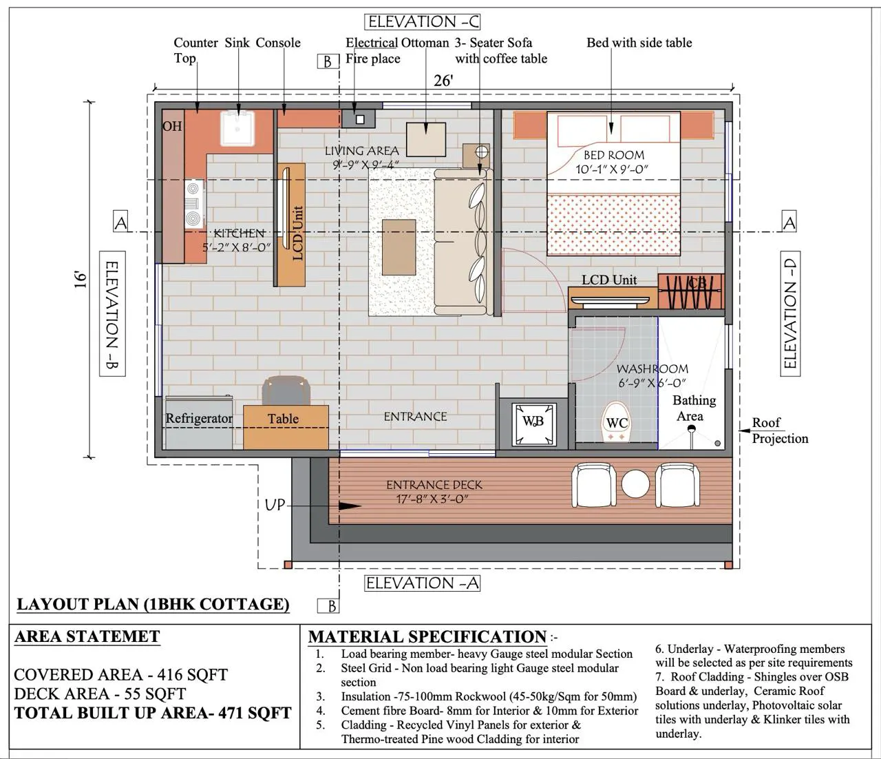 - MATERIALS: Treated MS Steel, Composite Fiber Planks, Rockwool Insulation, Branded Lighting, Jaquar Sanitary.