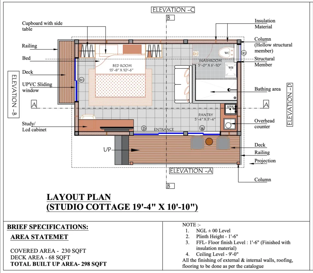 - MATERIALS: Treated MS Steel, Composite Fiber Planks, Rockwool Insulation, Branded Lighting, Jaquar Sanitary.